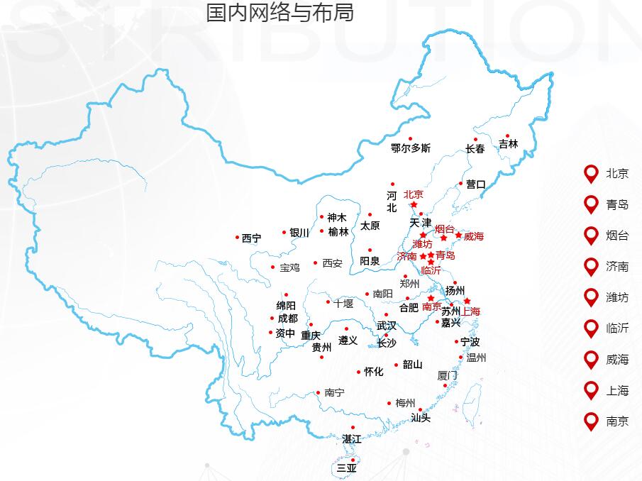 分公司分布北京、上海、南京、河北、济南、青岛、日照、烟台、威海、潍坊......等20余家子公司,服务全国近百个城市。